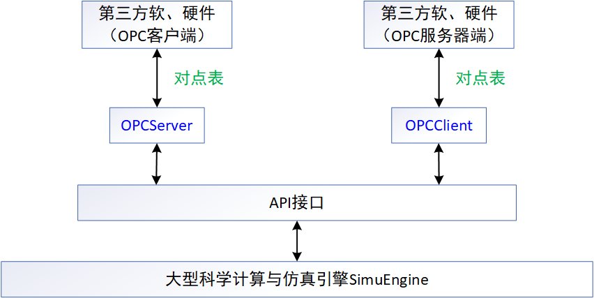 OPC通訊接口程序用于第三方支持OPC通訊協議的軟、硬件與SimuEngine的數據通訊,分為服務器端程序OPCServer和客戶端程序OPCClient,分別用于連接第三方的OPC客戶端和OPC服務器端。